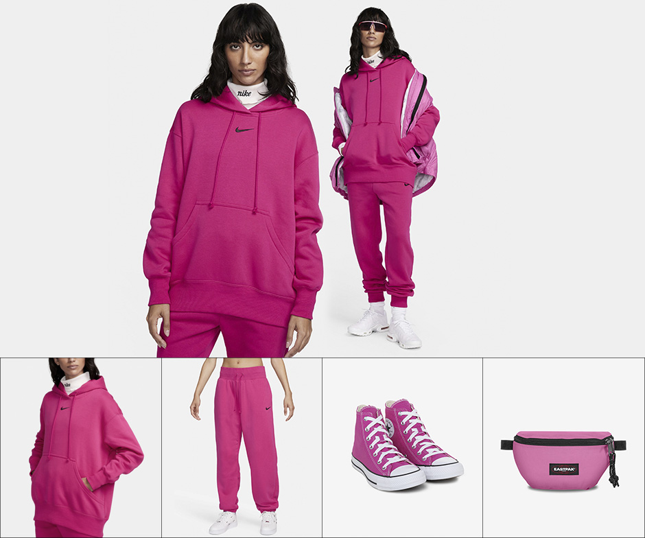Desta forma, sugerimos que optes por um hoodie rosa, combinado com umas calças e umas sapatilhas da mesma cor…