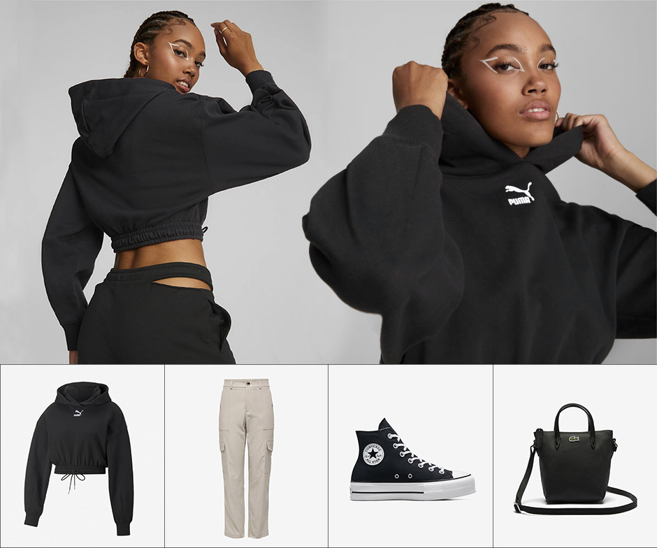 Por último, apresentamos-te um look casual mas desta vez feminino. Sugerimos que combines um hoodie preto com umas calças beges e umas converse de plataforma pretas para elevar um pouco mais o teu look. Como acessório, achamos por bem combinar uma bolsa preta e simples da Lacoste… O que te parece?