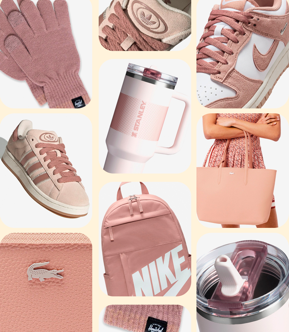 Este look rosa junta a Stanley Quencher Protour Flip, às Adidas Campus, às Nike Dunk Low, à mala reversível da Lacoste, às luvas da Herschel e à mochila Nike elemental. Torna-se impossível não sorrir ao ver esta combinação!
