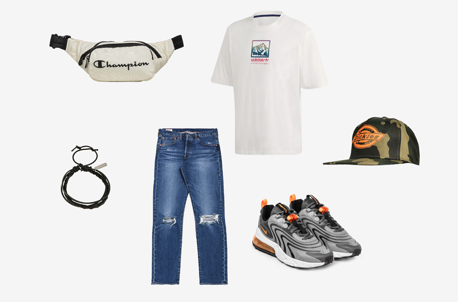 Já os acessórios, por sua vez, são a cola que juntam todo este look. Comecemos pela pulseira Cavermen Diadora. Feita por uma marca portuguesa, a pulseira minimalista em pele genuína e aço inoxidável junta descontração e estilo ao conjunto. Aproveitando o preto da pulseira e o branco da camisola e das sapatilhas, a bolsa de cintura Champion Reuben é útil, irreverente e intemporal. Apesar de se chamar bolsa de cintura, a nossa sugestão é que a uses a tiracolo. Por fim, temos um ponto de cor com o boné Dickies Oakland, com um padrão camuflado e o logo em cor de laranja.