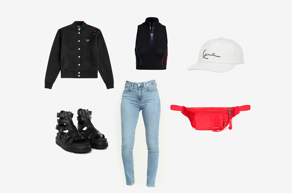 Para o caso de estar um dia fresco, não te esqueças do casaco da Fred Perry x Amy Winehouse Laurel Wreath. Tal como já podes ter percebido pelo nome, este casaco faz parte da coleção da Fred Perry com a Amy Winehouse Foundation. Para terminar em beleza, não podiam faltar os acessórios. A bolsa Eastpak Page vermelha em cetim é a peça de destaque e dá requinte a todo o look. Em jeito de contrapeso, o chapéu branco da Karl Kani une o conjunto com um toque simples, sóbrio e equilibrado.