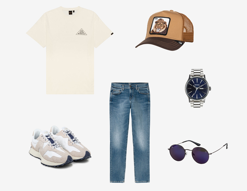 Mas vamos agora para as partes centrais da nossa sugestão masculina. A peça de destaque é o novo modelo das New Balance 327. Certamente, já ouviste falar nas 327, que esteticamente falando tem a borracha da sola estendida até ao calcanhar. As sapatilhas inspiradas nos designs da marca dos anos 70 já não são uma novidade, mas o mesmo não se pode dizer das suas cores. Com uns cordões que lembram as cordas náuticas, as 327 combinam na perfeição com a camisola Roza da Deus Ex Machina. A t-shirt feita na Casa dos Prazeres Simples, em Sidney, aposta na tendência dos grafismos, mesmo que de forma simples. Já só faltam as Carhartt WIP Rebel, com um corte slim fit afunilado, para completar o outfit.