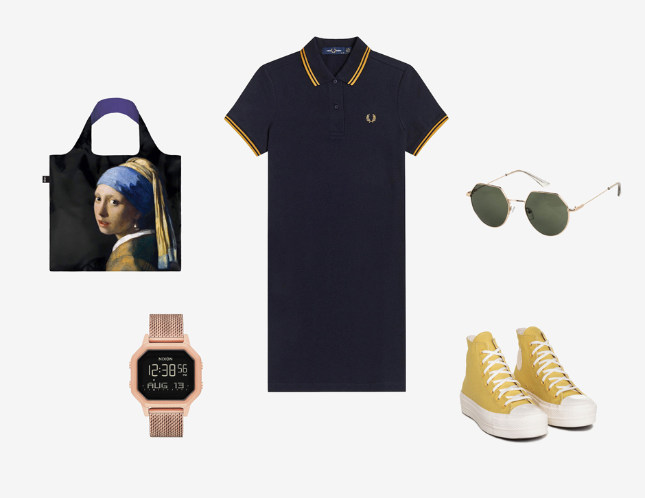Como não podia deixar de ser, a aposta nos acessórios é fundamental. Começamos por juntar um saco Loqi, dando um ar mais sofisticado e intelectual ao look com a Rapariga do Brinco de Pérola de Vermeer. As cores utilizadas pelo pintor do século XVII, que ficou conhecido por retratar momentos da vida doméstica, fazem ligação com o vestido e as sapatilhas, dando coesão a todo o conjunto.