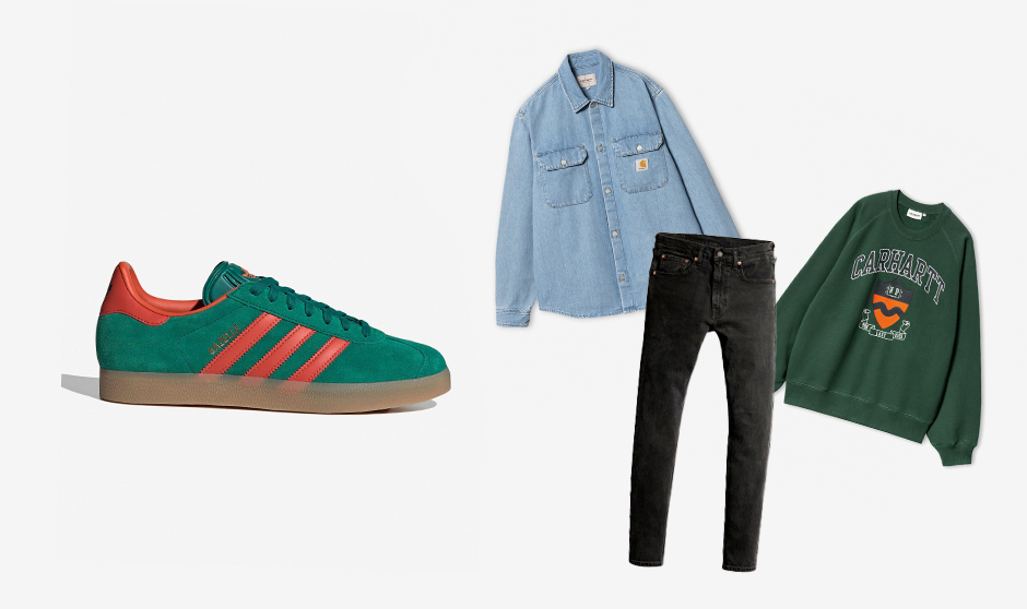 Para um look ousado e equilibrado, sugerimos que combines as novas Adidas Gazelle verdes e cor-de-laranja com umas calças pretas da Levi's, uma camisola verde e uma camisa de ganga, ambas da Carhartt WIP. Um outfit moderno, versátil e perfeito para um estilo urbano e arrojado.