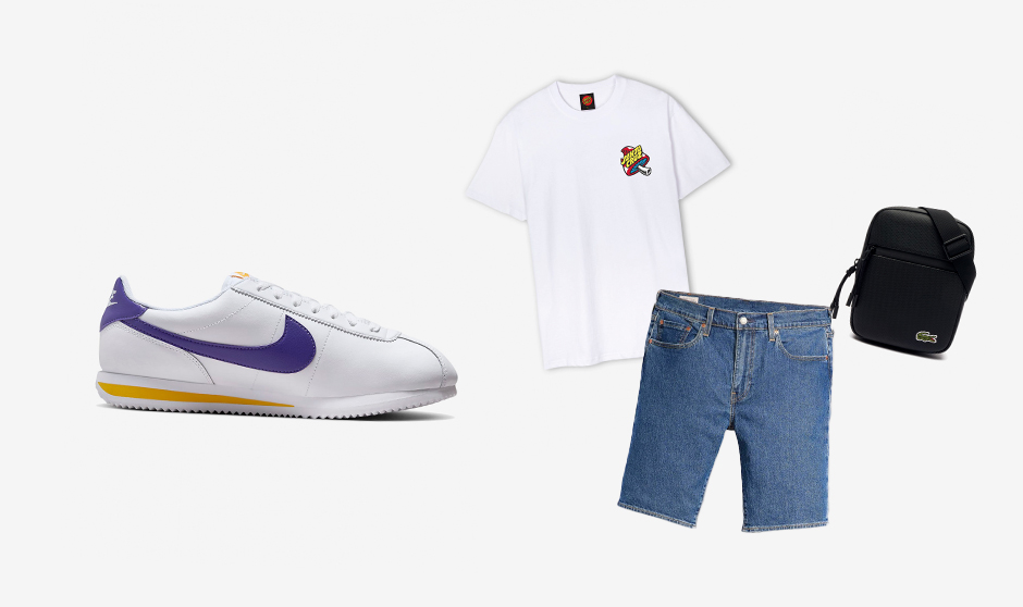 Para um look vibrante e cheio de energia, combina as Nike Cortez numa paleta de branco, roxo e amarelo com uns calções de ganga da Levi's, uma t-shirt branca da Santa Cruz e uma bolsa a tiracolo da Lacoste. Esta combinação destaca as sapatilhas coloridas e cria um look casual e moderno, perfeito para um dia descontraído.