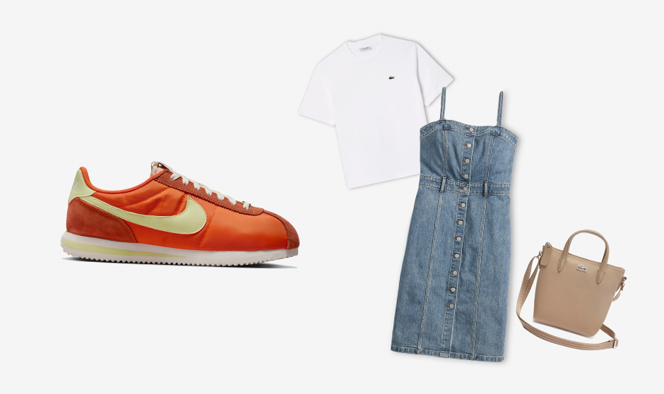 Como primeira sugestão, apresentamos-te um look cheio de estilo e personalidade. Combinamos as icónicas Nike Cortez em cor de laranja e amarelo com um um vestido de ganga da Levi's, uma t-shirt branca da Lacoste e uma mala bege da mesma marca.