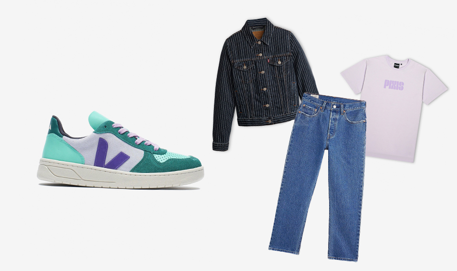 Transforma o teu estilo com as novas sapatilhas Veja em verde, rosa e roxo! Combina-as com umas calças de ganga da Levi's, uma t-shirt rosa da Pixis e um casaco da Levi's para um look que mistura descontração e criatividade.
